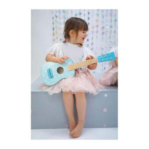 Pastelowo niebieska gitara z motywem graficznym w gwiazdki posiada sześć nylonowych strun, dzięki którym można ją dostroić do różnych dźwięków.