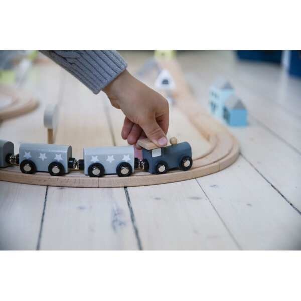 Niezwykła, pastelowa drewniana kolejka – spełnienie marzeń wielbicieli pociągów 🙂 Ten duży, drewniany zestaw obejmuje trzydzieści sześć elementó, sześć budynkó, kościół, trzy drzewa, dwa głazy, cztery znaki drogowe, most, piętnaście elemnetów drewnianego toru, trzy wagony łaćżąne na magnez i lokomotywę. Te urocze elemnty pozwolą stworzyć wymarzoną kolejkę, z cudownym krajobrazem. Zestaw charakteryzuje się niesamowitym wzornictwem, ogromną wartością edukacyjną oraz wielką starannością wykonania. Zapakowany w estetyczne, i niezwykle praktyczne wiaderko z rączkami łątwo się przechowuje, z pewnością posłuży przez długie lata -inspirując do kreatywnej zabawy, przeżywania niezwykłaych przygód i podróżowania palcem po mapie.
