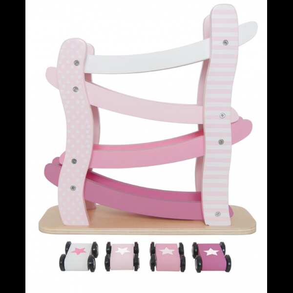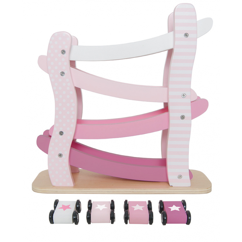 Drewniana zjeżdżalnia, pochylnia dla aut – to genialna zabawka dla małych fanek motoryzacji w nowej pastelowo- różowej kolorystyce skradnie serca dziewczynek. Ten drewniany tor samochodowy składa się z czterech połączonych pochylnie tras. Wystarczy umieścić jeden z samochodów na szczycie wieży i oglądać go jak zjeżdża w dół. W zestawie znajdują się cztery auta, można je puszczać wszystkie razem.