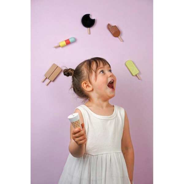 Idealnie sprawdzi się do zabawy dla małych cukierników. Dzieci uwielbiają podpatrywać otoczenie, dlatego też tak często bawią się w dom, restaurację lub kuchnię.Prezentowany zestaw drewnianych lodów może stanowić doskonałe urozmaicenie takiej zabawy.