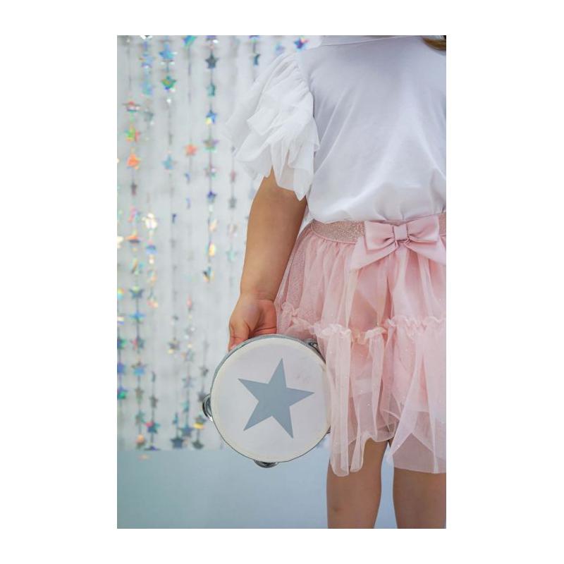 Piękne drewniane tamburyno w pastelowo różowej kolorystyce szwedzkiej marki Jabadabado, ozdobione trójkątami i gwiazdką. Będzie nieodzowną pomocą w procesie wykształcania wrażliwości muzycznej Twojego dziecka a także nauczy poczucia rytmu oraz poprawi koncentrację. Doskonały pomysł na prezent.