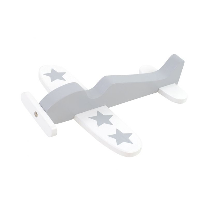 Drewniany samolot w szarej kolorystyce szybuje w górę, prosto w chmurę! Ten uroczy samolot służy do zabawy, ma ruchome śmigło i pobudza kreatywność dzieci do przeżywania podniebnych przygód!