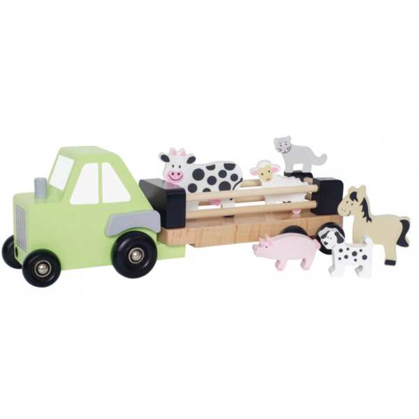 Wspaniała drewniany traktor ze zwierzętami na pokładzie , a wśród nich: koń, krowa, owca, świnia, kot i pies czyli cała gromadka ulubionych przez dzieci zwierząt hodowlanych. Niezbędna w każdym gospodarstwie wiejskim do przewożenia zwierząt i nie tylko. Idealna zarówno dla dziewczynki, jak i chłopca – sprawi wiele radości fanom motoryzacji, jak i wielbicielom zabawy w farmę.  Ta drewniana ciężarówka składa się z auta i przyczepy, którą można odpiąć oraz z sześciu zwierząt. To zabawka idealna do tworzenia niepowtarzalnych historii i przeżywania niezwykłych przygód.