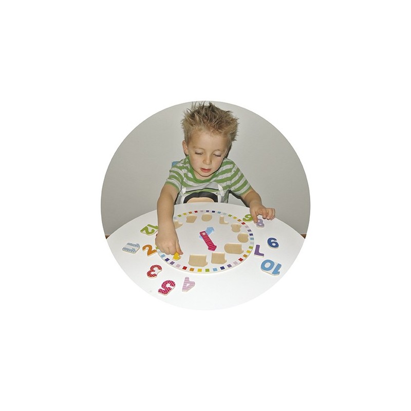 Drewniany zegar edukacyjny marki Jabadabado to zarazem puzzle i sorter, który poprzez zabawę wprowadzi dzieci w świat mierzenia czasu. Zabawa polega na ułożeniu wszystkich elementów oznaczonych liczbami od 1 do 12 we włąściwych miejscach na tarczy zegara.