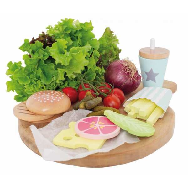 Fantastyczny drewniany zestaw hamburger zapakowany w efektowne pudełko na wynos, idealny do kreatywnej zabawy w komponowanie posiłków w sklep czy restaurację. Najlepszą formą rozwoju i nauki u dzieci jest zabawa, dlatego bawiące się dzieci najlepiej chłoną wiedzę z radosnej zabawy. W zestawie : bułka do hamburgerów, plaster mięsa, plaster sera,liść sałaty, pomidor, frytki oraz napój w opakowaniu ze słomką, a wszystko to zapakowanie w opakowanie na wynos. Jest to z pewnością w pełni zdrowy zestaw fas-food dla dziecka:)