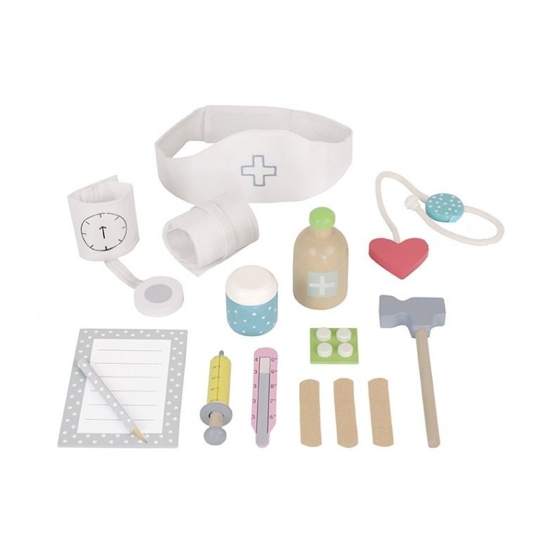 Piękny drewniany szary zestaw lekarski zapakowany w szykowną walizkę lekarską. W zestawie wszystkie niezbędne akcesoria Małego Lekarza wykonane z niezwykłą dbałością o każdy detal, większość wykonana z drewna i pomalowana ekologiczną farbą. Idealny do kreatywnej zabawy, odgrywania ról – uczy dzieci pokonać lęk przed wizytą lekarską.