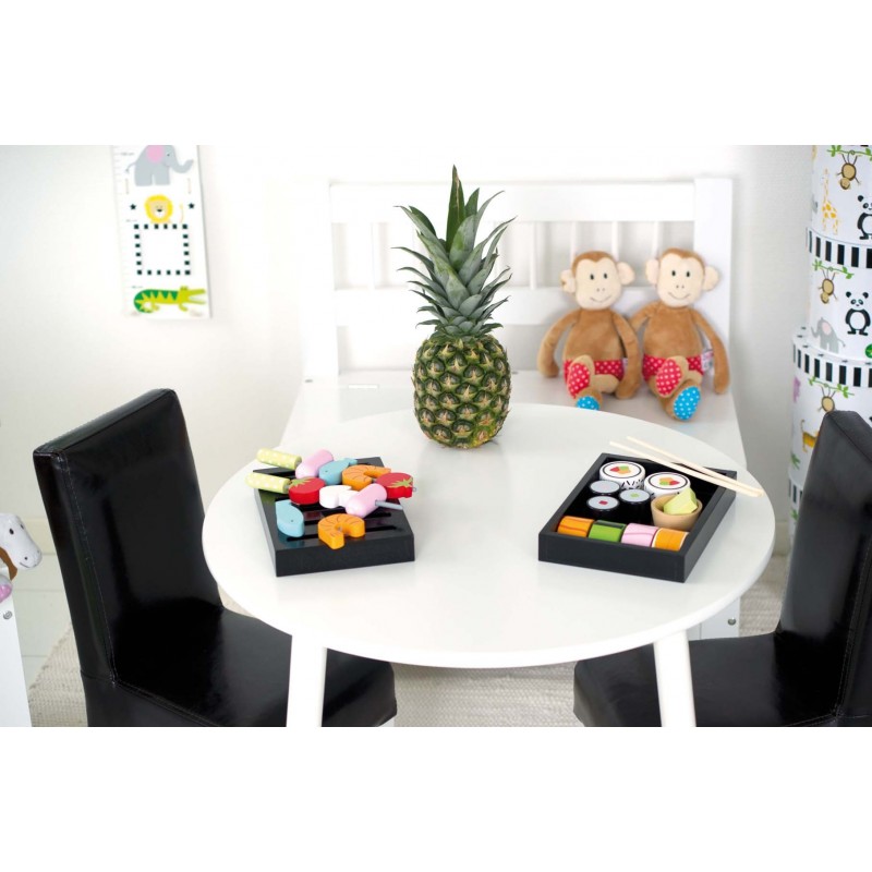 Drewniany zestaw sushi do zabawy – to idealny dodatek do dziecięcej kuchni, dla fanów wytrawnej kuchni japońskiej. Zestaw zapakowany w eleganckie czarne pudełko, z dziewięcioma kawałkami sushi sześciu rodzajów, z miseczką z wasabi oraz dwoma patyczkami do nauki jedzenia za ich pomocą. Świetny pomysł ćwiczenie koordynacji ręka -oko.