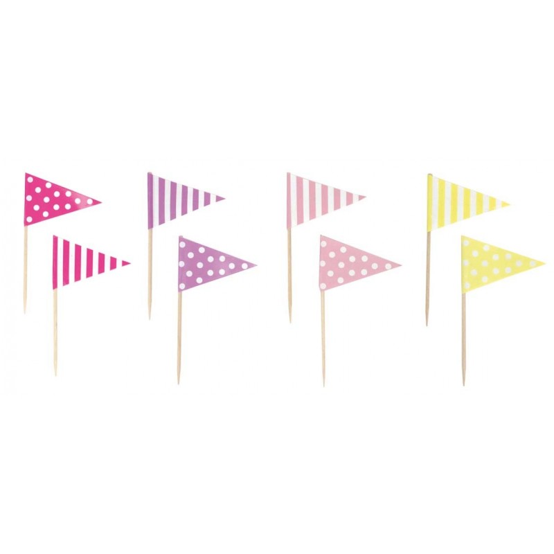 Uroczy zestaw szesnastu flag w kolorystyce różowej, fioletowej i żółtej w różne wzory, do dekoracji babeczek i muffinków. Flagi wykonane z papieru, przymocowane do patyczka, który umieszczamy w cieście – świetny dodatek do dekoracji przyjęć. Doskonale pasują do pozostałych dekoracji urodzinowych marki Jabadabado.