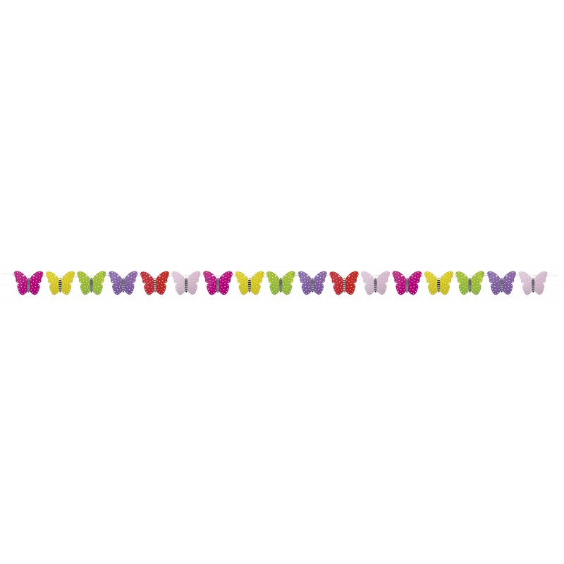 Wyjątkowa girlanda z motywem kolorowych motyli będzie idealnym dodatkiem dekoracyjnym w pokoju dziecięcym. Składa się z siedemnastu papierowych motyli o długości 4,5 metra.