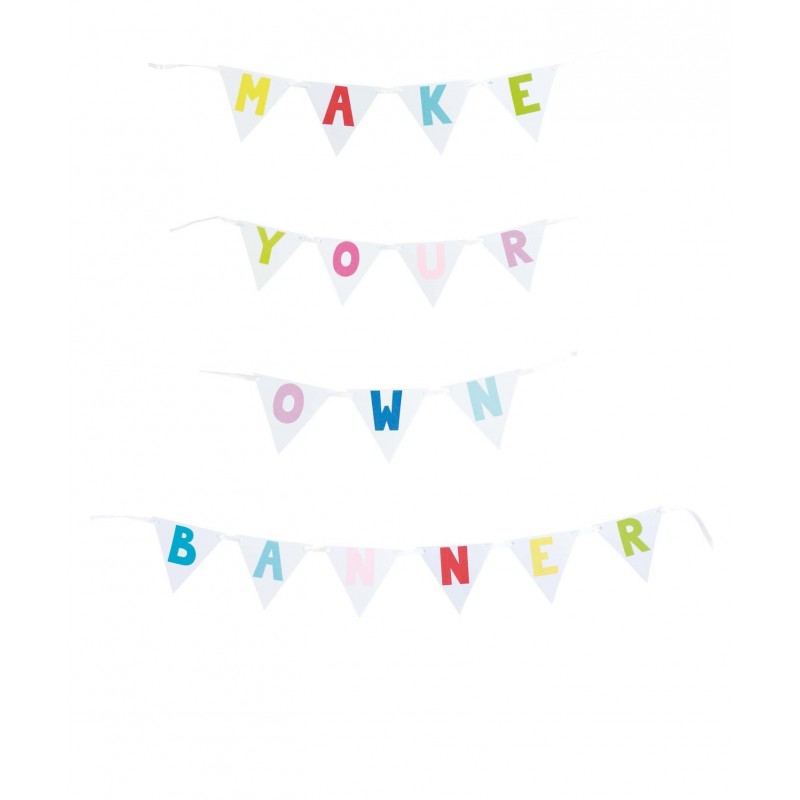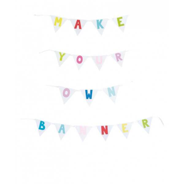 Girlanda stwórz własny baner to zestaw 128 kolorowych flag ze znakami. Wystarczy umieścić flagi w odpowiedniej kolejności by stworzyć własny, niepowtarzalny napis.