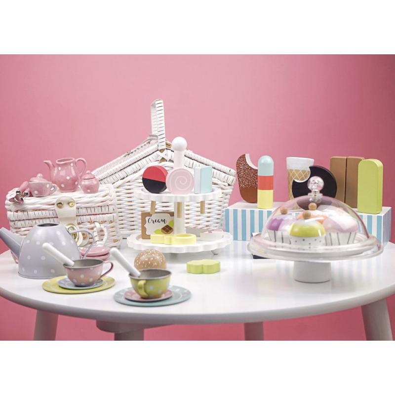 Koszyczek w kolorze białym z czerwoną wstążką, a serwis w kolorach pastelowych szarym, żółtym, niebieskim, zielonymi różowym w białe kropki wykonany z trwałej blachy. W zestawie: