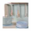 W skład zestawu wchodzą:  garnuszek, patelnia, rękawica kuchenna, 3 łyżki, pieprzniczka i solniczka.