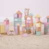 Klocki drewniane w kolorystyce pastelowej – błękitnej, słoneczny żółty oraz naturalne drewno.