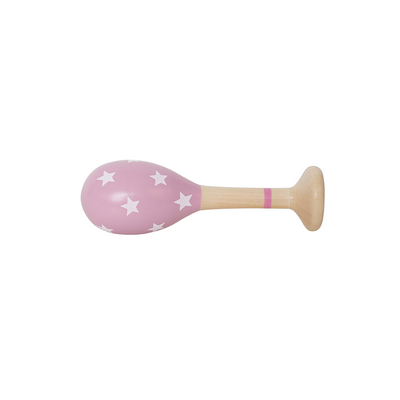 Duży drewniany instrument – marakas, grzechotka idealny, by wprowadzić malucha w niesamowity świat dźwięków. Zabawka rozwija zmysł słuchu oraz poczucie rytmu, przeznaczona dla najmłodszych dzieci.  Zapakowana w pudełeczko, pomalowana ekologiczną fabrą na kolor pudrowego różu, posiada białe gwiazdki – doskonała na upominek.