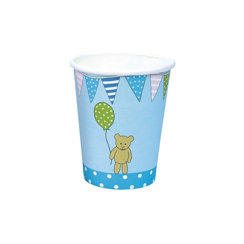 Zestaw ośmiu uroczych kubeczków w kolorze niebieskim z wizerunkiem smacznej babeczki oraz misia z balonikiem – idealne do nakrycia urodzinowego stołu. Doskonale sie komponują z pozostałymi akcesoriami urodzinowymi marki Jabadabado.