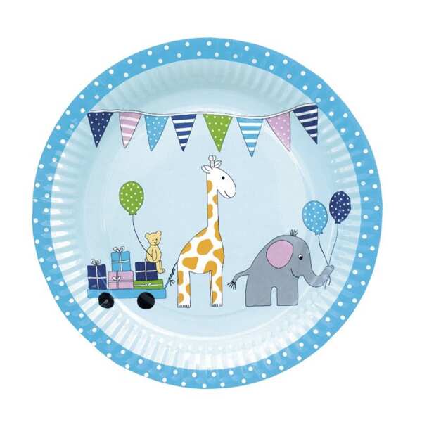 Zestaw ośmiu uroczych papierowych talerzy urodzinowych w kolorze niebieskim z zabawynym obrazkiem. Idealnie pasują do urodzinowch dekoracji marki Jabadabado, sprawią aby urodziny Twojej pociechy były niezapomniane.Wymiary: średnica 23 cm