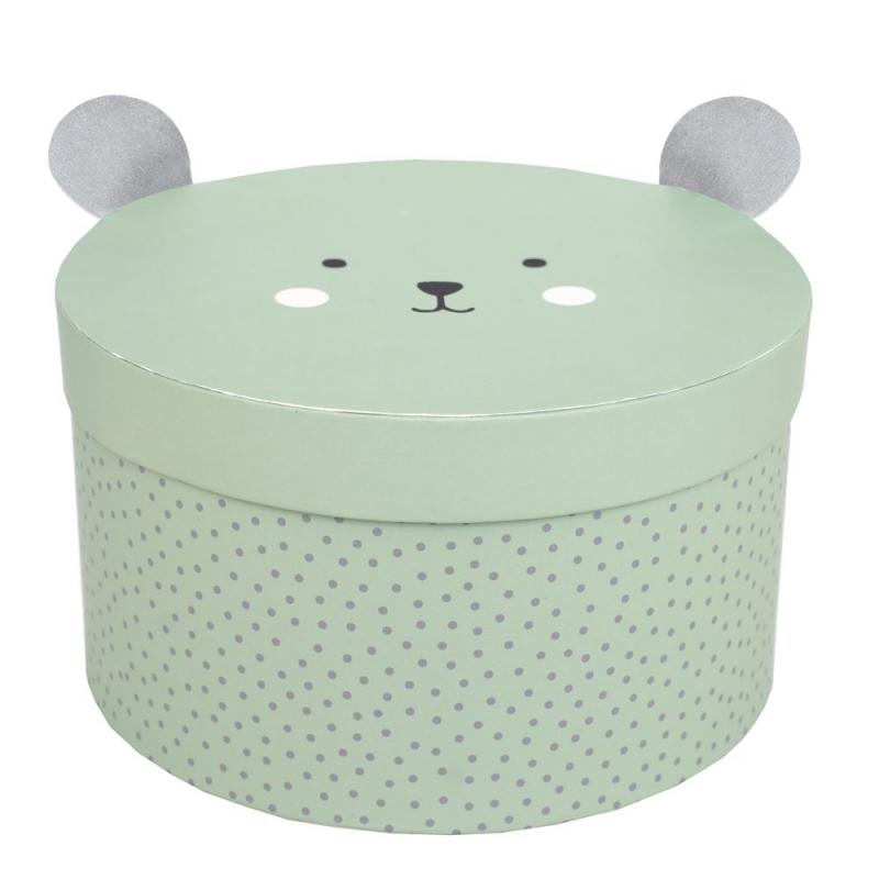 Zestaw dwóch uroczych okrągłych pudełek do przechowywania marki Jabadabado z wizerunkiem sympatycznego misia, z odstającymi uszkami w kolorystyce niebiesko -zielonej. Pudełka nie tylko pomogą utrzymać porządek w pokoju naszych dzieci, jak również będą niezwykłą dekoracją wnętrza pokoju malucha. Każde pudełko w innym rozmiarze, posiadają pokrywę do zamknięcia, wykonane z niezwykle trwałej lakierowanej tektury. Świetnie się prezentują ustawione jeden na drugim, jak również każdy z osobna będzie nieodzowną dekoracją w pokoju dziecięcym.