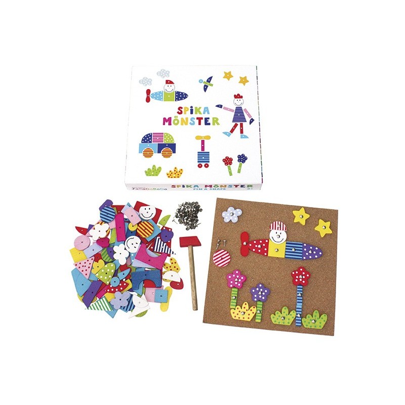 Drewniane kolorowe elementy, gwoździe i młotek – przybijanka Jabadabado- Twój maluch może wyczarować magiczne arcydzieła, ćwicząc koordynację ręka – oko, motorykę małą oraz myślenie. Przybijanka doskonale rozwija wyobraźnie i kreatywność malucha, a w towarzystwie uroczych kolorowych elementów dziecko poćwiczy także zdolności manualne i zręcznościowe.Wymiary: 26 x 26cm