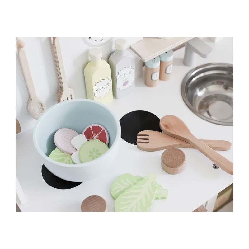 Wspaniały drewniany zestaw do przyrządzania sałatek, idealne akcesoria kuchenne dla Twojego malucha. W zestawie wszystko to, co potrzebne by przygotować zdrową i przepyszną sałatkę: drewniana miska, drewniane sztućce, oliwa, ocet winny, sół i pieprz, kawałek pomidora, ogórka, avocado, czerwonej cebuli i trzy liście zielonej sałaty. Akcesoria kuchenne marki Jabadabado to idealny dodatek dziecięcej kuchni, inspirujący do kreatywnej, twórczej zabawy.