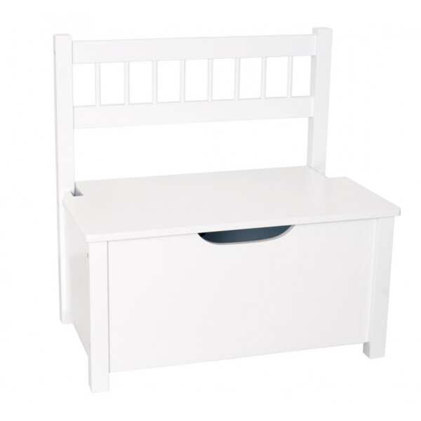 Skrzynia wykonana jest z drewna, pomalowana na biały kolor, posiada bezpieczne samozamykające się nawiasy, by nie przytrzasnąć małych rączek. Służy jako pojemnik do przechowywania lub siedzisko.