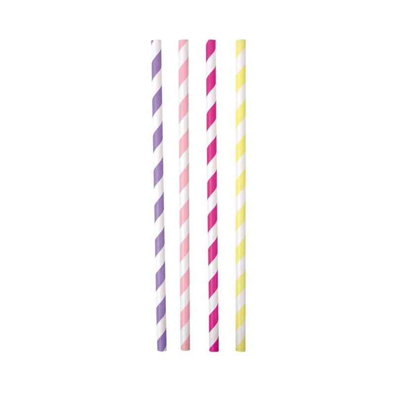 Zestaw dwudziestu czterech papierowych słomek w kolorze różowym, fioletowym i żółtym w białe paski szwedzkiej marki Jabadabado.