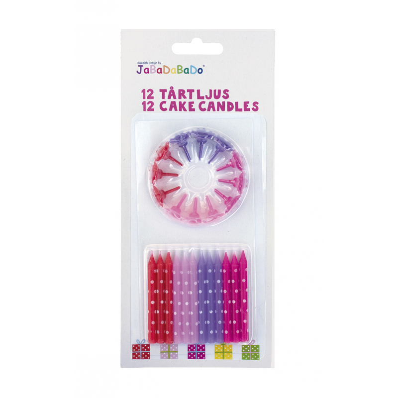 Zestaw dwunastu tortowych świeczek urodzinowych w różowej kolorystyce z kropeczkami, marki Jabadabado w zestawie znajdują się różwnież podstawki. Idealnie pasują do urodzinowych gadżetów w tej samej kolorystyce.