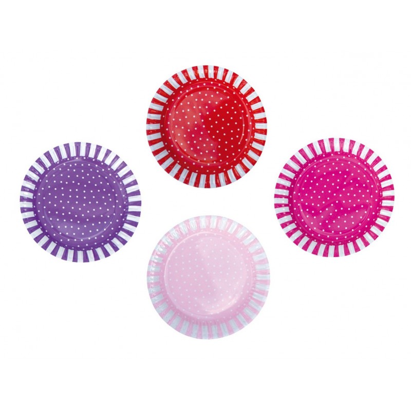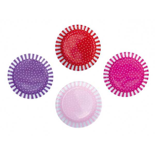 Zestaw ośmiu papierowych talerzy urodzinowych w kolorze: różu, fioletu i czerwieni w delikatne kropeczki. Idealnie pasują do urodzinowch dekoracji marki Jabadabado, sprawią aby urodziny Twojej pociechy były niezapomniane.Wymiary: średnica 23cm