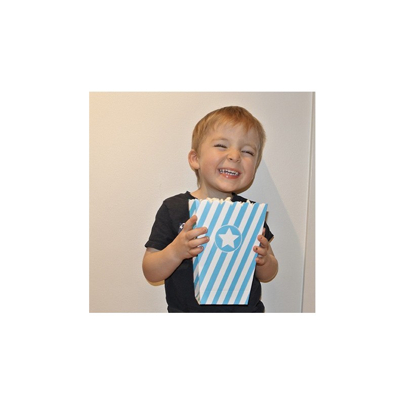 Zestaw ośmiu tekturowych pudełek w kolorze niebieskim i zielonym na popcorn lub inne przekąski – idaelne na urodzinowe przyjęcia. Doskonale pasują do urodzinowych gadżetów w tej samej kolorystyce.Wymiary: 19 cm x 13 cm