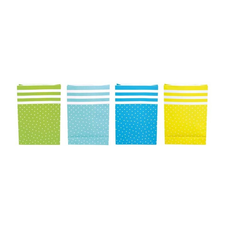 Uroczy zestaw ośmiu papierowych torebek na słodkości w kolorystyce niebieskiej, żółtej i zielonej w białe kropki- charakterystyczne dla szwedzkiej marki Jabadabado. Torebki będą świetnym uzupełnieniem dekoracyjnym stołu solenizanta, lub doskonałym pomysłem na zapakowanie słodkości w podziękowaniu dla swoich gości.Wymiary torebek: 23×16 cm