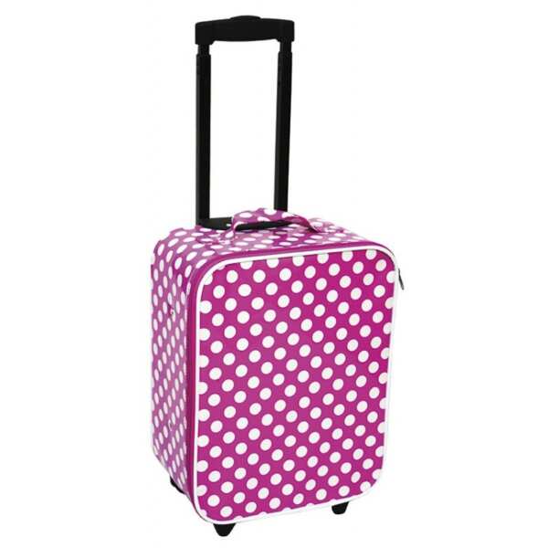 Stylowa designerska różowa walizka w białe kropki szwedzkiej marki Jabadabado. Idealna na bagaż podręczny dla mamy, oraz pierwsze wyprawy dla dziecka. Posiada regulowaną rączkę. Niesomowicie trwała i solidna.